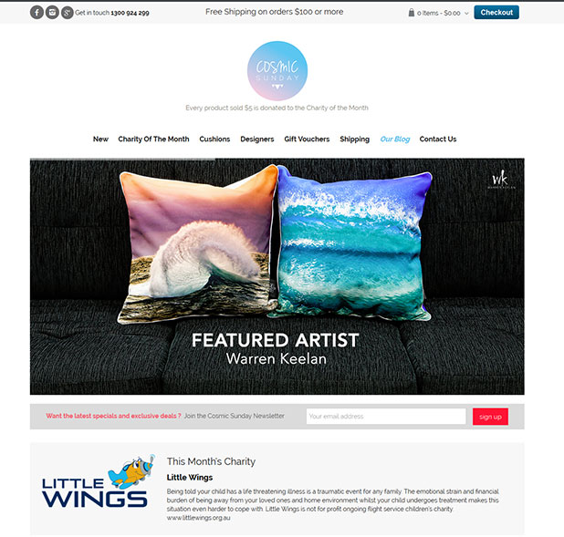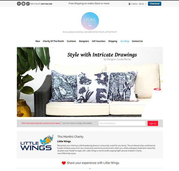 Cosmic Sunday, a responsive website was designed with an aim to brighten up your living spaces. On Cosmic Sunday, you can buy bright and colorful cushions that have been specially designed by talented artists from around the globe.